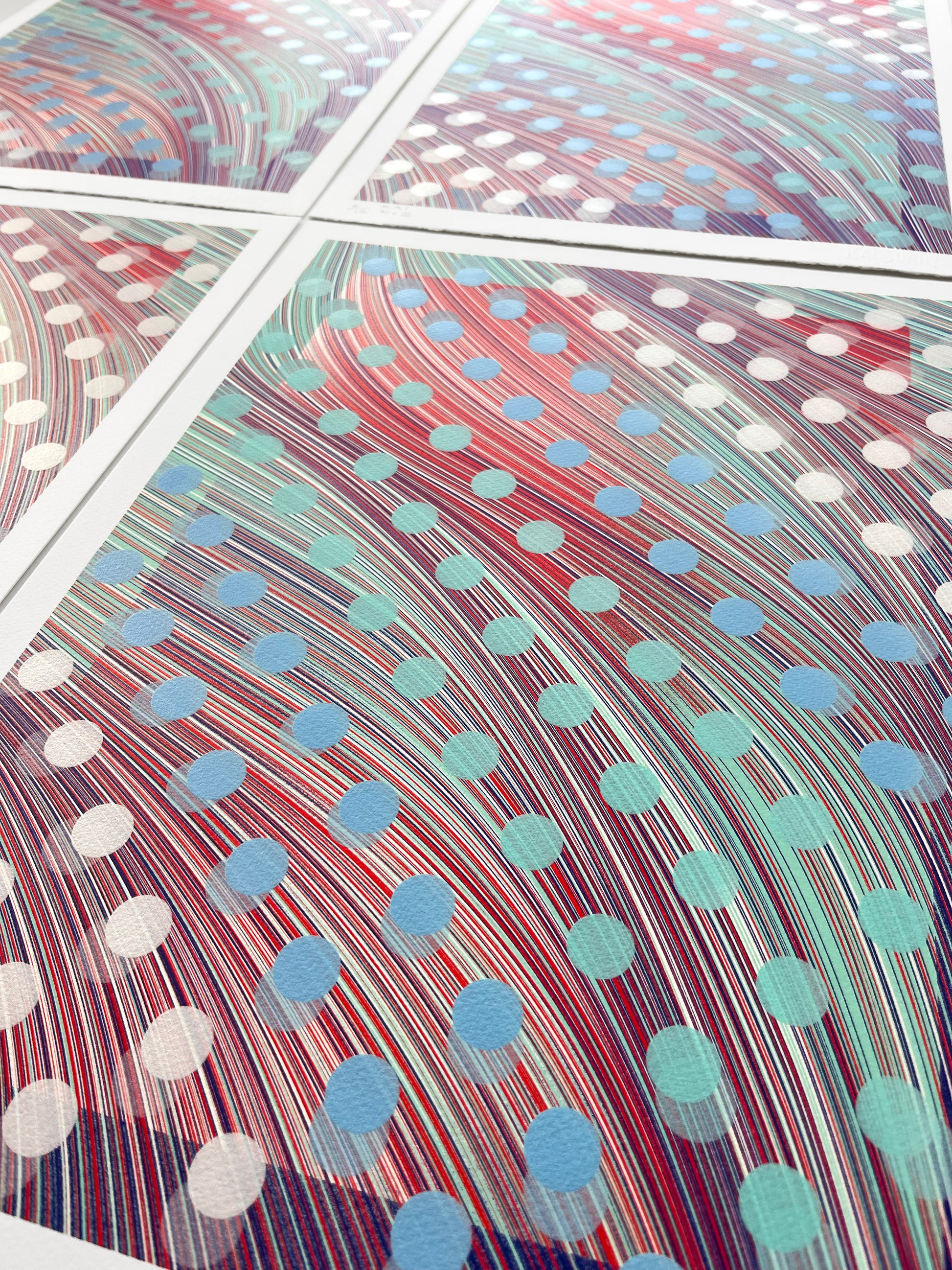 Hand pulled 3 colour screen print with hand finish acrylic dots